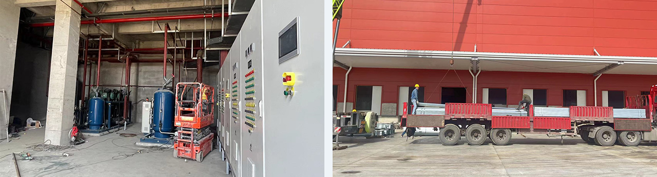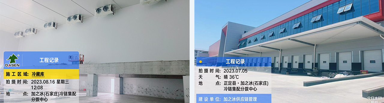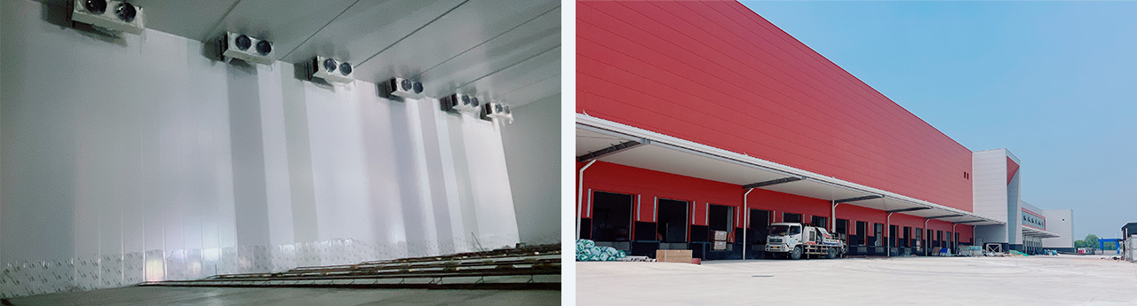位于河北石家莊市,低溫兩間高溫兩間,總工程容積93600立方米,低溫存儲14000噸,高溫150噸。穿堂1070m2。采用的R507直膨制冷。末端采用冷風機,熱氣融霜。